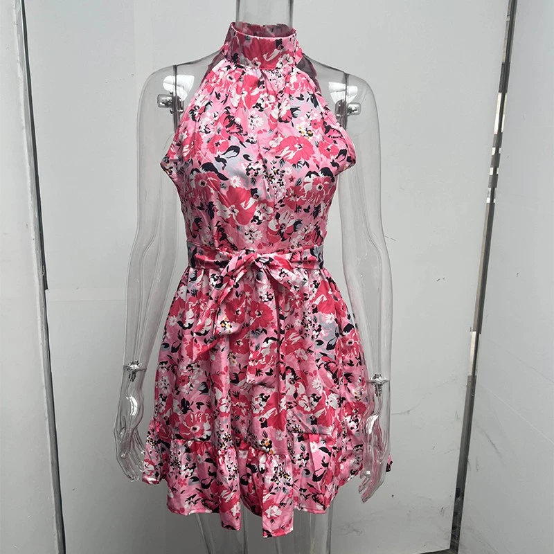 New Flowers Print Halterneck Dress Summer Fashion Temperament Lace-up Ruffled Dresses For Women