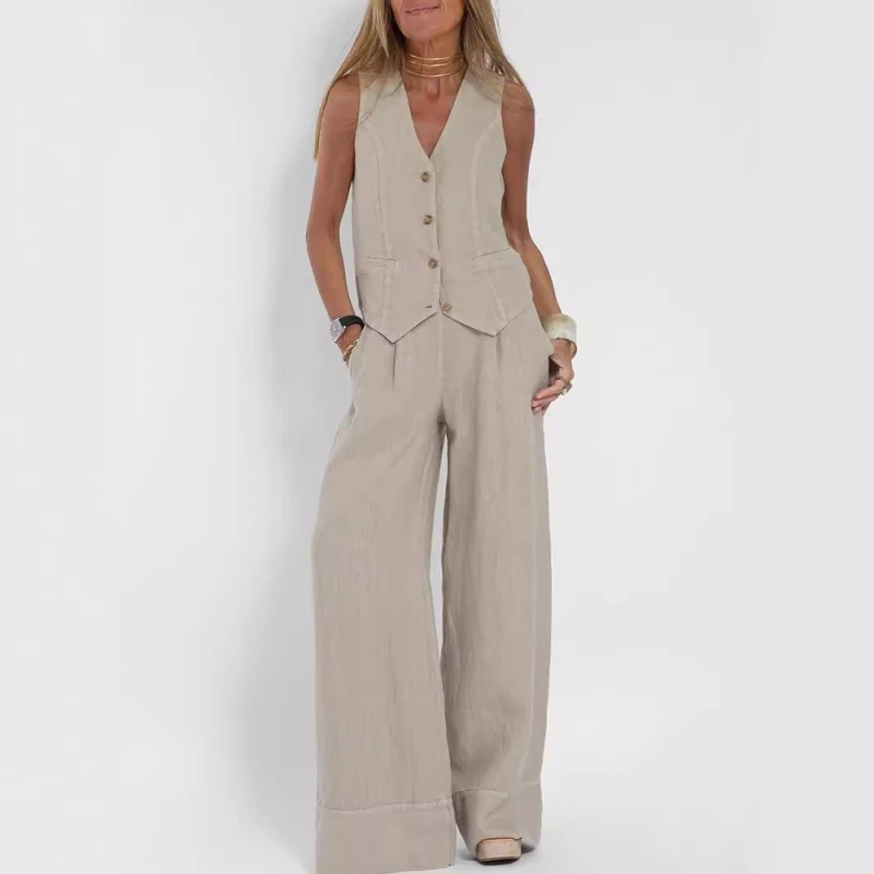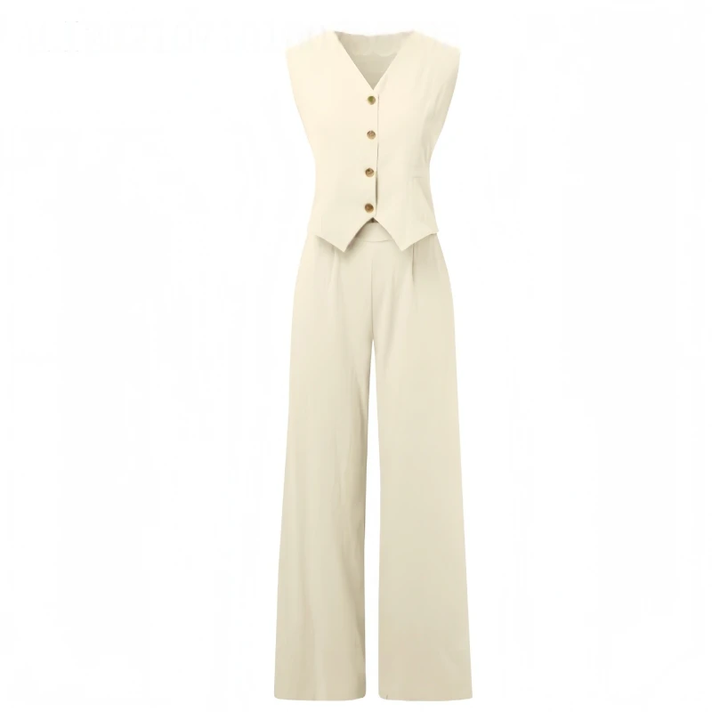 Summer Vest Suits V-neck Botton Sleeveless Top And Loose Straight Trousers Casual Womens Clothing